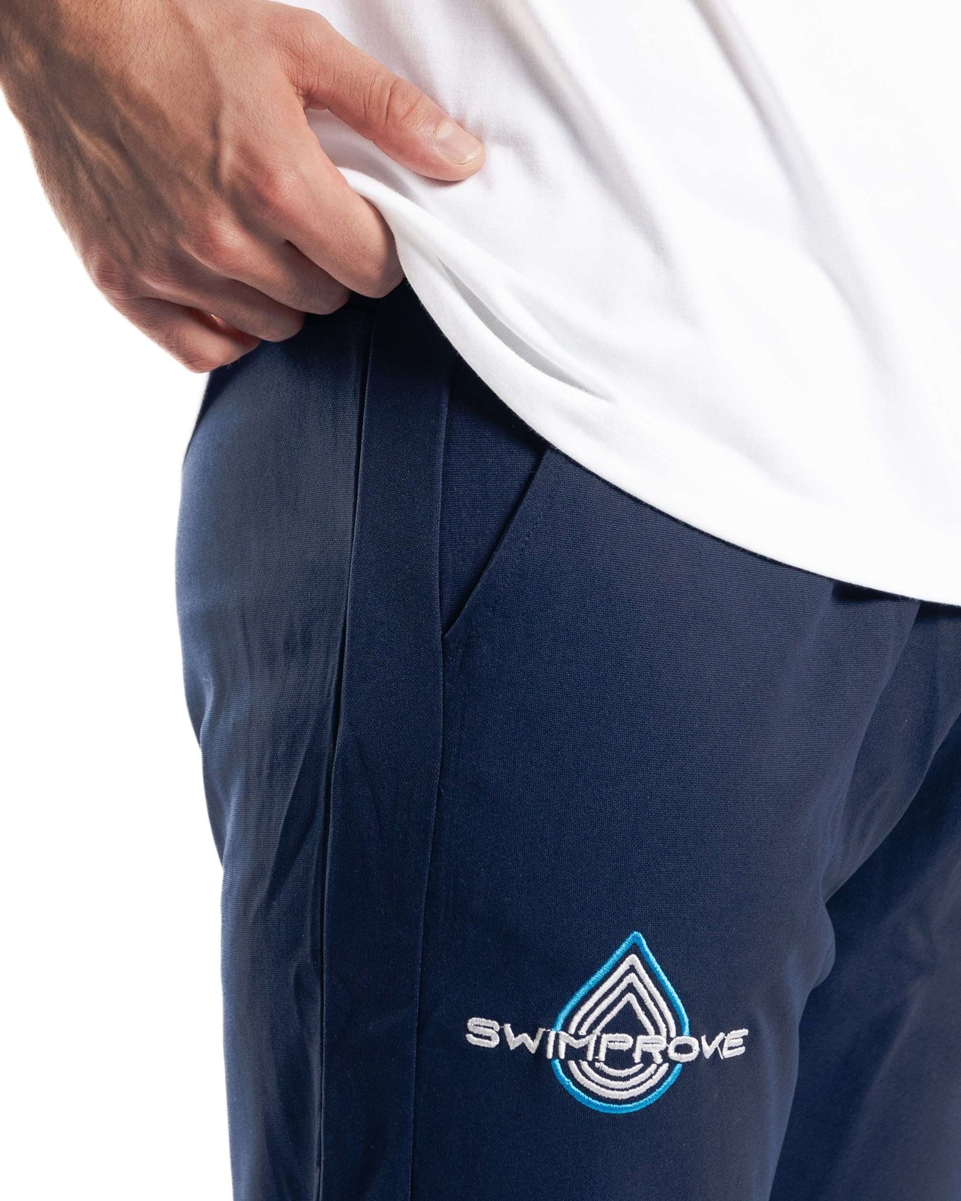 Il design è caratterizzato dal logo Swimprove ricamato sul lato destro, mentre le zip alle caviglie aggiungono praticità e un tocco di stile in più, consentendo di regolare facilmente l’ampiezza del fondo del pantalone.